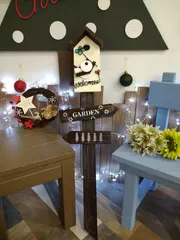 NEW ガーデンサインピック ■作品内容WSで作ったガーデンサインピックです☺️ワイヤーは家で作った物を持ち込みしました。鳥さんはシマエナガをイメージしました。■工夫ポイント秋冬っぽくシックにまとめました。ワイヤーのハートと四葉にレジンを付けてアクセントにしました。 お店のクリスマスの飾り付けがとても素敵です❣️先日作