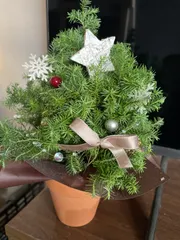 NEW クリスマスツリー🎶 お花屋さんのワークショップ第2段!ヒムロ杉と、オーナメントを選んで、、自分でツリーを作りました、、、。何回も刺し直してみたけど、ツリーの形にならずまとまってませんけど、、、。先端を三角にするのが難しい、、、、。 センスがなくて、、娘たちに笑われました😂