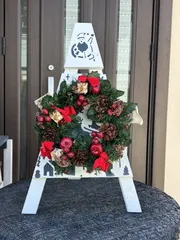 NEW リーススタンド ■作品内容、WSで作ったリーススタンドにステンシルをして、クリスマスリースを飾ってみました。■工夫ポイント ホワイトクリスマスで、白のスタンドにし、ステンシルのみのリーススタンドでも、いいように沢山ステンシルをしました。※以下カインズクリスマス部門のみ入力■使用した商品