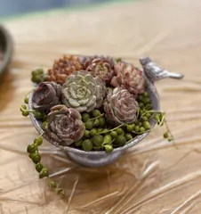 バードカップつくり体験 お花とみどりのフェスタに行って多肉寄せ植えの体験教室に参加しました😊ステキなバードカップにネルソルをのせ、可愛いエケベリアさん達を置いていきます🥰そして隙間にグリネを使うのですが、思いの外隙間ができてグリネさんだらけ😅むぎゅって寄せたり、隙間をセダムで埋める寄せ植えが慣れてるので、隙間をグリネで埋め