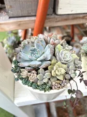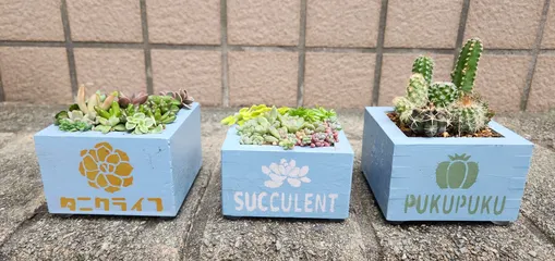 NEW 枡のリメイク鉢に寄せ植え ■作品内容以前作った枡のリメイク鉢に昨日貰ったサボテンや家で大きくなってきた多肉を植えました■工夫ポイント3つのリメイク鉢を並べてひとつのものになるように3つとも違う感じに植えてみました