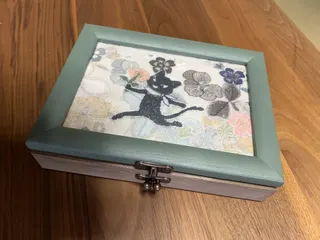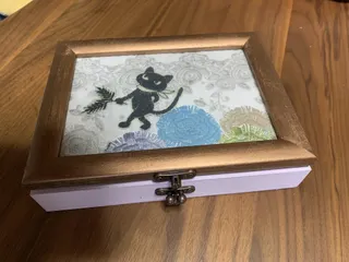 アンティーク風小物収納ボックス マイショップにリクエストしていた作品❣️やっと作ることができました😆💕 収集しているブローチを入れたいと思います🎶 フォトフレームの中は両面 ハギレや刺繍テープで作ってみました🐈⬛✨そのまま飾っておくのもかわいい🩷