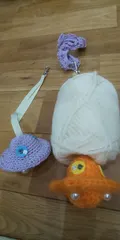 ヤーンホルダー ヤーンホルダーは毛糸が出てきやすく編みやすくなる物です置いて使うのと吊り下げて使うのがありますが、手首に付けて使えるように作ってみました 糸止めにUFOを自作しました紐に毛糸玉を通して手首にとめればクルクル回るので糸がスムーズに出てきます🛸👽️編み物しやすくなりました☺️