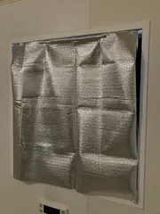 NEW 取り敢えず付けました。 ■材料 100均の突っ張り棒1本 レジャーシート1枚 結束バンド数本 画鋲1つ(穴開け用) ■作り方 ①窓枠より少し長めにして突っ張り棒を伸ばす ②突っ張り棒の幅に合わせてレジャーシートの幅を合わせて折り曲げる(縦側) ③レジャーシートの上の方を、突っ張り棒の太さに合わせて折り曲げる(横側