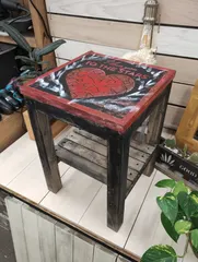 NEW B&Bシェルフスツール 以前のミニサインボードの塗料から同じパターンでシェルフツール作りました!隠れハートも刻んであります!わかりづらいです✨今日は隣でミラーの作業されている人がいたので控えめにダメージ加工しました😊真っ白シェルフツールも作りたいです✨今日もありがとうございました