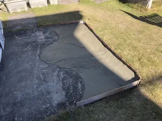 子供が軽自動車から普通車のアコードへ乗り換えた為、駐車場からはみ出てしまうそこで、家にある資材をフル活用してDIYを行いました先ず、コンクリートを流すので、板で囲いを作ります止まっているキャンピングカーを前側に1.5m移動させると、後ろにアコードがはみ出さず入ります駐車場の入り口も芝生を植えてました