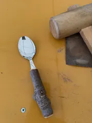 NEW 小枝のスプーン 昨日参加したロハスフェスタで作りました。 といっても簡単です。 スプーンかフォークを選びます。ちょうど良さそうな形と穴の大きさ(これがなかなか探さなくて時間がかかりました)の小枝を選んで ヤスリで角を取って スプーンを穴に刺したあと、小枝のうしろから木槌でカン