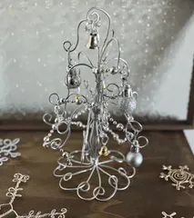 今年はシルバーツリー 今年は11月からあちこちでシャンパンゴールドのツリーのワークショップをしています。(デザインは私の先生で認定講師として教えています😊) シャンパンゴールドは華やかで豪華です✨ 自分用はシルバーのミニツリーこちらもキラキラでかわいいので委託先にも置いてもらってます🎄右はほんとの大き
