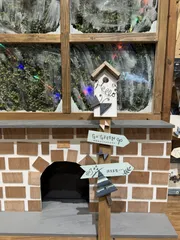 ガーデンサインピック 何回か作るチャンスがあったのですがなかなか予定が合わずやっと作って来ました。いろいろな工程があって楽しかったです😊ワイヤーがあまり長くなかったので考えていた文字は作れずそのうち家で作ろうかな🤔 先生力作の暖炉の前でパチリ📷 お手製窓の外には電飾も光ってまし