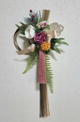 お正月飾り🐎🌹🌼🎀  市の講座で、お正月飾りのしめ縄を作りました🌿。   松や椿、薔薇、南天などの、飾りをバランスを見ながら、一つずつ着けていくのは難しかったです。   ⭕の形のしめ縄は数が少なくて、希望の方はじゃんけんで3人。    私は、こちらの形が気に入ったので、金に黒がア