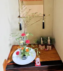 お正月のいけ花 ■作品内容 お正月のいけ花を飾りました。🌿🌼🤍❤️💚 ■工夫ポイントお花は、南天、水仙、カーネーション、金蓮花です。 WSで作りました ミニ門松🎍寿🎍🐎も一緒に✨️。 (^.^)(-.-)(__)