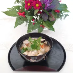 ■作品内容結婚以来、我が家のお雑煮は主人が作ってくれてます。1日と2日に2回作ります。 ■工夫ポイント鶏皮、かつおだしで出汁をとり、松茸、かまぼこ、人参、三つ葉などが入ってます。鶏のだしと松茸の風味がとても美味しいんです。変わっているのは、刻み海苔をかけて頂くんです。結婚して初めて主人の実
