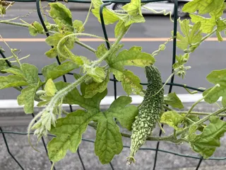 ゴーヤ(こぼれ種シリーズ) こぼれ種のゴーヤちゃん最近 朝晩の冷え込みがあり 葉色が変色してきましたでも 未だ実は沢山😳根性あるなぁ~🤔💦