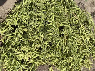 晩成型の枝豆半端ない量です 葉っぱが付いた状態 ■育てた野菜晩成型枝豆(秋収穫用) ■エピソード(チャレンジしたきっかけなど) 毎年育ている枝豆 今年は調子付いて沢山蒔きました✋1本につく 豆の数がえげつなくて どう考えても もう 食べきれません😰 半分収穫しました