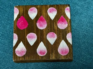なんちゃってアクリルコースターの続き お試しステンシルシートでステンシルしてみました👀をショボショボさせながらカッターで切り抜いたのが一発で分かるバラバラ加減😅グラデーションも小さくて難しかったです💦もう少し大きさが揃うように作り直して、今度は大きい雫バージョンも作ってみようと思います