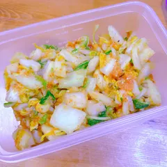 簡単白菜のキムチ ■材料白菜 1/4塩 小2〈つけ汁〉唐辛子 大1味噌 大2醤油 小2和風ダシ 小2にんにくチューブ 小1生姜チューブ 小1りんご 1個(すりおろす)※甘めが好きな場合 ➕ハチミツ 大1〜2■作り方①白菜を洗ってから ひとくち大に ざく切りし、ボールに入れる②、①に塩小2をかけ混ぜ合わせ、重石をし(石
