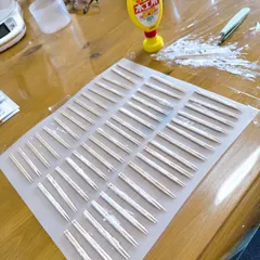 (映えない写真ですが😅)ニット帽編み機の毛糸を巻く部分を作っています🧶楊枝を2本ずつボンドで貼り合わせています。 8月に新しい家族が増える"かも"しれないので("かも"とは、1週間体験してからお迎えするか決めるので、お迎え出来ない事もあるため"かも"と書きました)なので、まだ決定ではないのに、気持ち