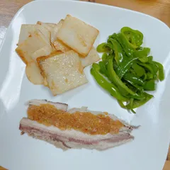 今日の夕飯 流行ってる、茹でさんま に、叩いた はちみつ梅を乗せたもの🐟 無限ピーマン出汁醤油味、長芋ステーキ。焼きさんまよる茹でさんまの方が好きかも‼️🤩