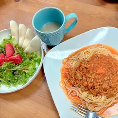 今日の夕飯 https://diy-square.cainz.com/chats/o0yod9gcwtxlrbzb…の正解は、ミートソース🍝でしたぁ😆私の作るミートソースは、ちょっと作り方が変わっていて、具を炒めたら、水を少し多めに入れ、鶏がらスープ、胡椒、バジル、トマトケチャップ、粉チーズで味付けして、硬めに
