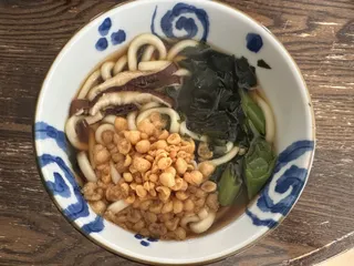 わかめと天かすに、しいたけと、ネギを入れました。これからの季節、あっかいうどんは体が温まります☺️