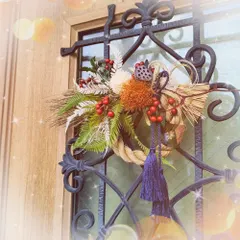 ドライフラワーのしめ飾りを玄関ドアに✨️ 🎍作品内容先日ワークショップで作ったしめ飾りを、玄関ドアに飾りました✨️☺️コレです😌🐴工夫ポイント毎年、元旦にドアの前で記念撮影をするので、隠れてしまわないよう、少し上の方に飾りました🤭また、治安を信じてないので😅、ワイヤーで3ヶ所、後ろのアイアンに括り付けてます😆💦 直射日光が当たりが