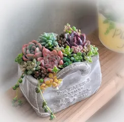 久しぶりの多肉寄せ植えバイキング🪴午前はワケあって遅くに参加したので、そのまま時間をつぶして午後も参加することにしました☺️こちらは午前の寄せ植え🕚️選んだのはこちらLINEのお友だち登録で、いつもの小苗ひとつに加えて、ハロウィンのフィギュアをいただけました👻ネックレスは半分余ってるので、おうち寄せ