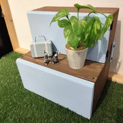 いろんな置き方ができるステップ収納を作ってきました🎵今回も、消えゆくアクアを使いました🩵側面の掛け金を外せば、大、小、ふたつの箱に分離できます😃くっつけて使うのが前提なので、大の丁番は長辺(背面)に付いてますが、小は短辺(側面)に付けることで、フタの開閉がスムーズに出来るように工夫されています😌見本