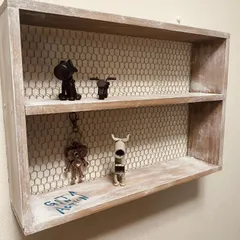 WSチキンネットでアンティーク風ディスプレイ棚 溶接で作った男前な小物が似合うように、ガッツリ汚しで作ってきました😁一応玄関周りの雰囲気ともあわせて、ホワイト汚しで可愛らしさも残しつつ😘壁掛けにしようと思ってたのに、WS中すっかり忘れてて棚の上にステンシルしちゃった😅⬇️家で吊り金具付けたら、全く見えなくなってしまったので、別場所にちょこっとステ