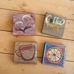 ステンシルコースター ずっと下書き保存されてて、投稿忘れてた作品です😅半年以上前に、今回はもうちょっと大胆に作るぞ‼️と挑んだステンシルコースターでしたが、どうしても思い切りが出ず、大した色遊びができませんでした。オレンジ柄のコースターは、たまたまステンシルシートが小さくて、うまい具合に枠が出来ました😉今ならもうちょっと