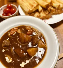 今日の夕飯🍽️ビーフシチュー🥩 半額で買って冷凍しておいた牛肉🥩本日、ビーフシチューにして頂きました😋娘がお菓子作りに使って残った生クリームをすこーしかけて😉いつもはフランスパンと一緒に食べるのですが、買い忘れたので食パンを細く切って、焼きました🍞ルーが残ったら、まっさんさんのデミソースを作ろうと思っていたのですが、キレイに食べ切