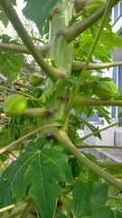 いつまで元気? パパイヤ 結実しました! 30cmくらいの苗が、3ヶ月で樹高2.5m.幹周50cm に成長しました。東海地方は熱帯ですね。冬越しの検討中です。