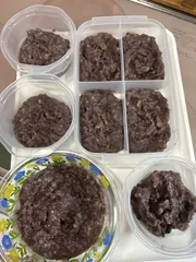 ■材料小豆 300g 、砂糖100g、塩1g位 ご飯お茶碗に半分■作り方小豆を綺麗に洗い 鍋にひたひたの水を入れて10分ほど煮てから渋切りをしてから圧力炊飯器に3合の目盛りまで水をいれて炊き繰り返して2度炊きします 小豆が手で潰せるようになればOKです2度目に炊く時に砂糖、塩、