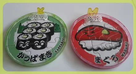 小さなジグソーパズルをコースターに🍣 🍣お寿司屋さんの景品で頂いたジグソーパズルをコースターにしてみました。お風呂場 カビ予防剤の容器の蓋を台座にしました。右側の蓋を使用スポンジでペイント✨K✨持ち手にもレジン枠でかっぱのK✨M✨持ち手にもレジン枠でまぐろのM2.ジグソーパズルをパウチ上レース部分は店舗名があります。