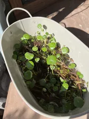 ウォーターマッシュルーム🌱 かれこれ8年前に購入した1.5寸鉢のウォーターマッシュルーム🍄枯れても枯れても復活する強さ🤭真夏に水切れでカリカリに枯れてしまっても復活するんです😅いつの間にかブリキの鉢に穴が空いてしまっててお水がすっからかんでカリカリになってたので思い切って茎も根っこも大胆にカット✂️して新しいブリキ缶に植え替え