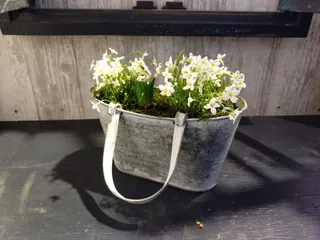 白を基調とした寄せ植えにしたくて、ヒナソウとヒヤシンスを白にしました😊ヒナソウの影になっていますが、ムスカリ×3と水仙を植えています根本はグリーンのモスを使っているので、スッキリ仕上がりました👏このブリキの鉢がすごく好き😄取っ手は動くので、置いても引っ掛けても使えます👍️これからモリモリになるみたい