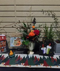 ハロウィンのアレンジメント入れ替え 先週作ったアレンジメント一部入れ替えで作り直ししました☺️赤いケイトウの入った花束と家でドライにしておいた物を追加横にソフォラとリプサリスを置いたら良い感じに😆 先週のアレンジメントどこを入れ替えたでしょうか?