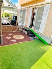 スロープ&照明で、安心安全のお庭散歩 これまでワン達が庭へ出る時は、人と同じ階段を登り降りしており、また夜は照明もなく危ない状態でした。 そこで、足場板に人工芝を貼りウッドデッキへ接続してワン専用のスロープ化、そして街灯を設置しwi-fi電球にすることで、庭へ出る際には明るく段差の無いお庭散歩ができるようになったよ♬