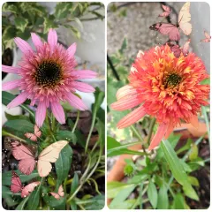 かわいい八重咲きのエキナセア 春にCAINZで苗を見つけて、2品種購入して育ててきました。「イレジスダブル」咲き始めはサーモンオレンジ🧡咲き進むとピンク色に変化します🩷花持ちがとてもいいです。「バタフライキッシーズ」は、ピンク色で、花つきがいいコンパクトな品種です❣️小さい苗だったので、小さな鉢で育てていましたが、そろそろ鉢増し