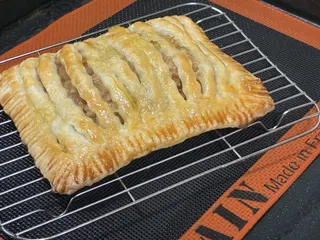 シュトーレンを焼いてオーブンがまだ温かいうちに… アップルパイを焼きました〜🍎 シルパン(シリコン製のメッシュシート)にとりあえず冷凍のパイ生地を伸ばして保存してたアップルフィリング🍎をのせて挟んでギュッギュッとして…🤣 チーン🛎️と焼きました。 食べる時はバ
