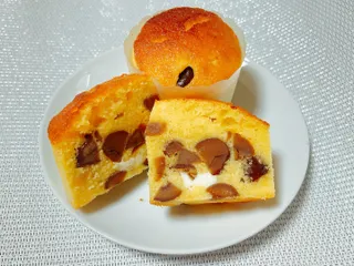 カインズのマロングラッセ入りマフィン カインズの新商品の「マロングラッセ」をマフィンにいれてみました✨ マロングラッセの甘さが引き立つように、有塩バターを今回使いました☺️ 下の部分には、クリームチーズもいれ生地にメープルシロップも混ぜ込んでます❣️ お試しで作ったので、2個にしましたが美味しくてもっと食べ