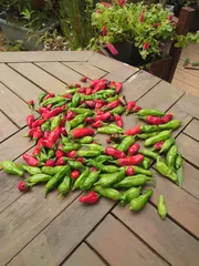 ししとうが真っ赤で激辛 ししとうはたくさん収穫できるのですが、真っ赤なししとうも同じ苗からできています。前の収穫の時は真っ赤なししとうを食べようと炒めました。すると、激辛💥今回は真っ赤なししとうは乾燥させて、薬味にしようと思います。青いのは炒めて夕飯にします😋🍴💕