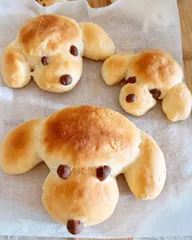 NEW わんこパン🐶🍞 あなた好みのお顔は?🐶■作品内容わんこのシンプルなパン🍞白いわんこの予定が焼きすぎて茶色いわんこになりました🐶茶色いので見た目は固く見えますが、ふわっふわで冷めても美味しかったです😋 ■作品のこだわりポイントパン作り初心者が、生地を捏ねるところから頑張りました。目の大きさ、マズルの大きさ、