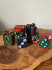 端材に色を塗って飾りつけました😊モールでリースやツリー🌲を作って貼り付けたり、リボンをつけてプレゼントに🎁