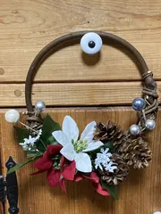 クリスマスリース ■作品内容■工夫ポイント100円均と拾った松ぼっくりでリーズナブルに作りました■使用した商品松ぼっくり、造花