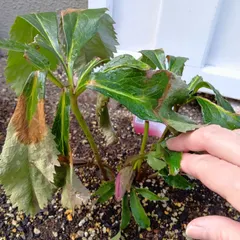 クリスマスローズ インディアンレッド 昨年植えたクリスマスローズの葉っぱが枯れていたので、このままダメになってしまうのかと思いましたが、下の方に蕾が2つありました大丈夫かな?