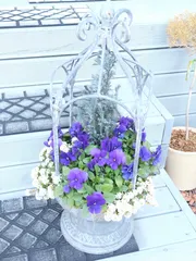 シャビープラントスタンドの寄せ植え ビオラ「エーゲブルー」とアリッサム、真ん中にブルーのコニファーを植えてみました。少し暖かくなり、エーゲブルーの花数が増えてきました。