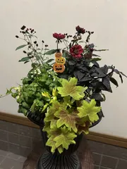 ハロウィン🎃の寄せ植え 寄せ植え講座🍀🍀ゴブレットのような鉢に🍷銅葉ぷちダリアを中心に千日坊(ふたつにわけたよ!)、パープルフラッシュ、ジュズサンゴもみじ葉ゼラニウム🍁、黄金カズラを3箇所に分けて植え込みました。涼しくなり、お店にお花の数が増えて🪴🪴🪴毎日がお花に癒される日々になりそう💕🍀 ご覧いただきましてあり