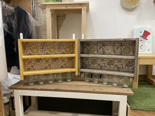 HL.15 六角瓶ストック棚 右側はご一緒した方の作品です!柄は20種類から選べるんですよ♪☆補足☆🍦欲しさに慌てて投稿しましたので…😅情報薄くてごめんなさい。取れる図柄の位置限られてるのに、同じ壁紙でこんな取り方できたっけ?と不思議に思っていたら敢えて上下逆さまなんですよ〜取付金具は板用と石膏ボード用の2種類いただけます。荷重