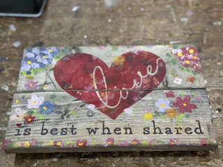 タイニーサインボード(愛は分かち合うことが一番) 3兄妹を連れてWSへ 久しぶりのB&Bで2回目以前はミニサインボード 出来上がりまでドキドキ💓剥がした時の出来上がりの満足感がいいね❣️楽しい😀 今年はボード作り頑張りたいでーーーす。