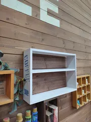 孫に取られた〰️ ワークショップで作ったチキンネットでアンティーク風ディスプレイ。帰りに娘の家に寄り、作った作品を見せると、ほしい〰️と孫に言われ、そのまま孫の部屋に作品は消えていきました。後で見に行くと、収納棚になってました🥰ステンシルもしたんですが、写真の撮り方が悪くて写ってない😔また、来週もワークショップに行き